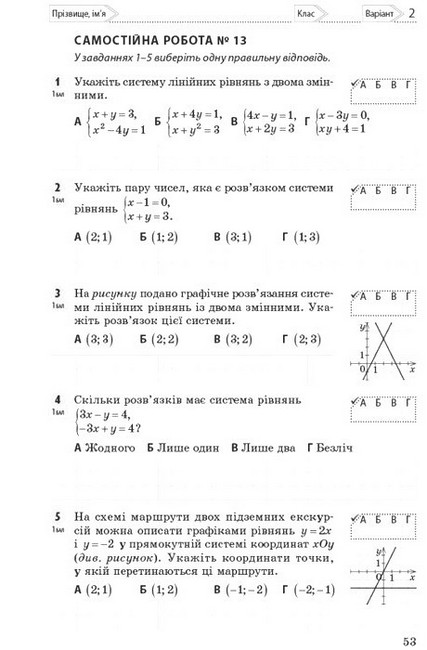 Посібник призначений для організації регулярної діагностики та оцінювання результатів навчання учнів та учениць з кожної теми на основних етапах її засвоєння. У посібнику запропоновані два види перевірочних робіт: самостійні (діагностичні) та підсумкові роботи, наведені у двох рівноцінних варіантах. Наприкінці посібника наведено завдання для проведення бліцопитування, подані також у двох варіантах. До кожної самостійної та підсумкової роботи створено її інтерактивний варіант з автоматичною перевіркою, доступний за QR-кодом або коротким посиланням.