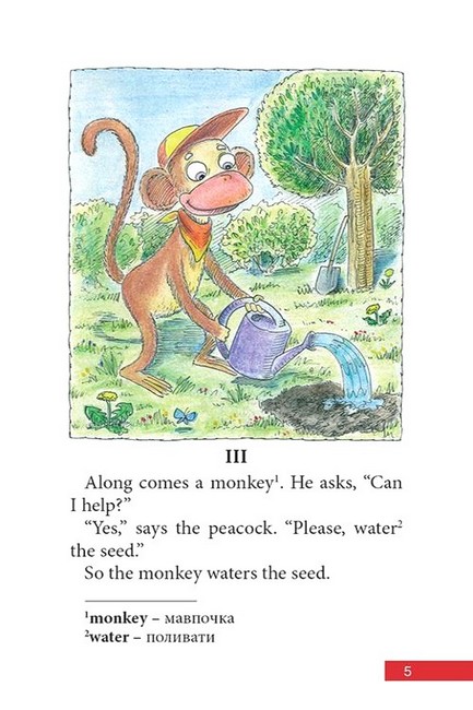 Ти полюбляєш читати казки про звірят? Тобі цікаво дізнатися як матуся качка доглядає за своїми каченятами? Як мавпочка, слоник, жирафа та кролик допомагають павичу виростити смачні яблука? Як маленький півник служить чоловікові на фермі? Читай із задоволенням про пригоди героїв казок та вивчай англійську мову. Читанка англійською мовою для учнів закладів загальної середньої освіти, ліцеїв, гімназій.
