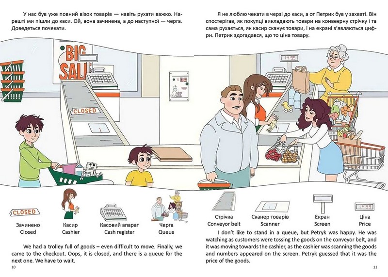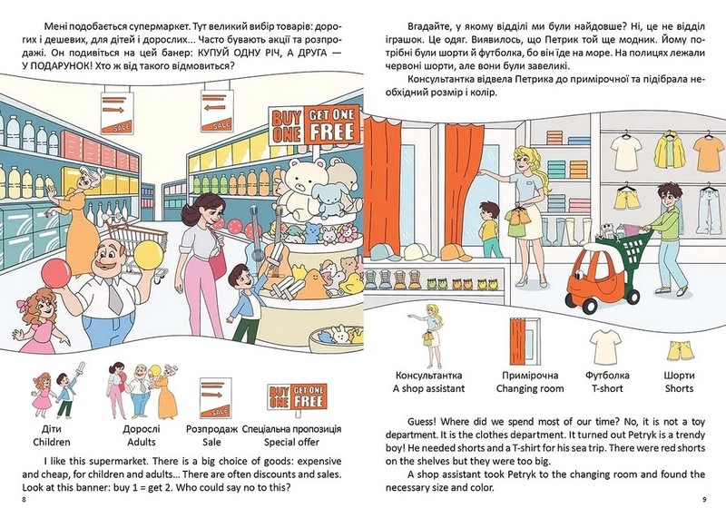 Разом з Петриком та його братом діти залюбки відвідають супермаркет й весело та легко вивчать слова, які стосуються покупок та різних видів магазинів.