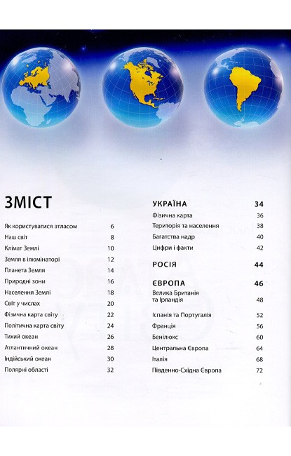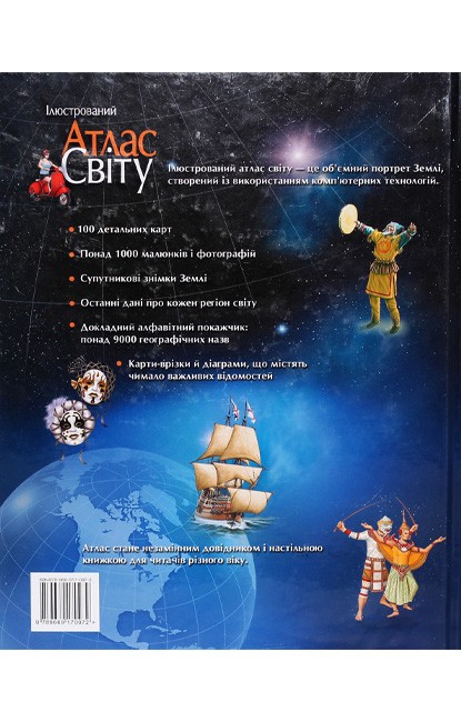 Атлас світу містить понад 100 карт, складених з урахуванням новітніх політичних і географічних даних, і 1000 ілюстрацій, зокрема цінних супутникових фотознімків, які дають змогу юним читачам побачити Землю у незвичному ракурсі. Видання розповідає про формування нашої планети, її місце у Всесвіті, геологічну будову та природні зони Землі, клімат і погоду, моря й океани. Атлас докладно характеризує кожний регіон світу, надаючи новітні відомості про природні ресурси та економіку, визначні пам'ятки та історичних осіб, природу, традиції, звичаї, основні віхи історії. Великий розділ присвячено Україні — її географічним особливостям, історії та культурі. Беззаперечним достоїнством видання є дуже докладний алфавітний покажчик, що містить понад 9000 географічних назв. Його доповнюють численні графічні елементи, що допоможуть читачам швидко й легко знайти будь-який географічний об'єкт. Атлас стане чудовим довідником для допитливих читачів, які хочуть поглибити свої знання про світ і зміни в ньому.