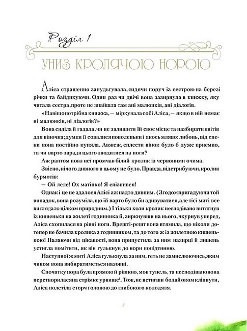 Одного разу дівчинка Аліса вчинила трохи необережно — не довго думаючи, вона побігла слідом за білим кроликом і... потрапила до Дивокраю! Там із нею почали відбуватися найнеймовірніші пригоди. Черепахи, що вміють розмовляти, жива колода карт, омари, які танцюють, Синя Гусінь, що курить кальян, і усміхнений Чеширський Кіт — далеко не всі, з ким познайомилася Аліса. Але найголовніше інше — Аліса вчить нас: щоб іти правильною дорогою, необхідно добре знати, куди і з якою метою ти хочеш прийти!