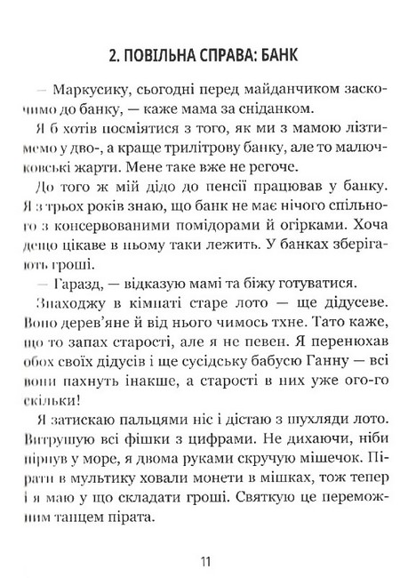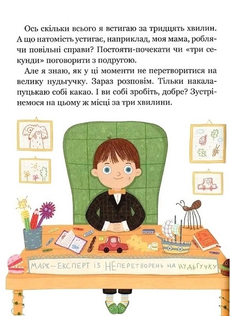Шестирічний Марко знає, як зробити цікавою будь-яку справу. Своєю безмежною фантазією він перетворює нудні збирання в садок на підготовку до подорожі в космос, підслуховує розмови гілок на дереві й навіть бере участь у кулінарному шоу, уявляючи, як смакує книжкова шафа. А тоді святкує все переможними танцями пірата, саламандри чи каменя.