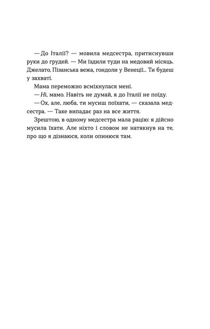 Підлітковий/молодіжний роман із нотами тревел-фікшн, романтики та дорослішання. Підійде підліткам і дорослим, котрі люблять атмосферні історії з Італією, мистецтвом і тонким гумором. Чудовий варіант для легкого літнього читання або «детоксу» після важких книг.