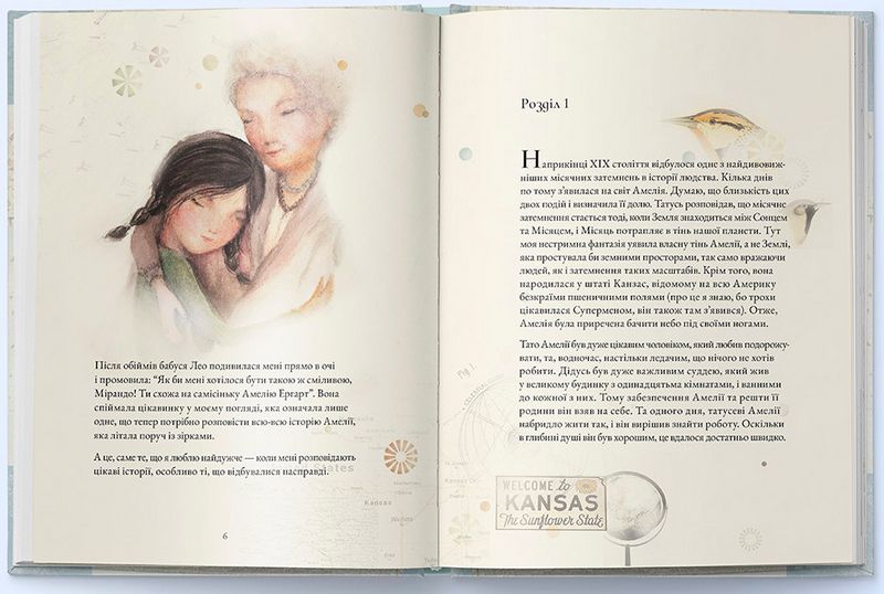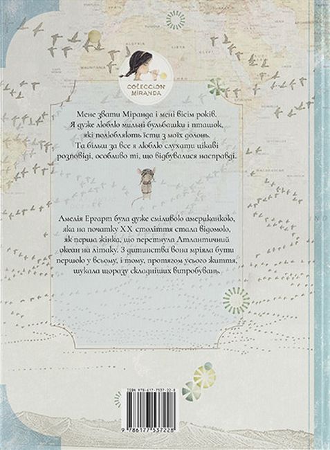 Міранді 8 років, вона любить мильні бульбашки і пташок, які поміщаються в долоньці. Але більше за все на світі вона любить слухати всілякі історії, особливо якщо вони реальні. Цього разу Міранда разом з родиною збирається відвідати золоте весілля бабусі Кон, але бабуся Лео (молодша сестра бабусі Кон) сказала, що ні в якому разі не полізе в цій "залізний мотлох з крилами" (так старенька називає літак). Міранда зовсім не боїться літати, і бабуся Лео каже що вона така ж хоробра як Амелія Ергарт, яка літала серед зірок.