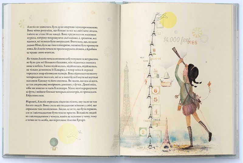 - крім біографії льотчиці Амелії Ергарт, читачі так само дізнаються про батьків авіації братів Райт, цікаві факти про літаки і польоти, а також про частини літака