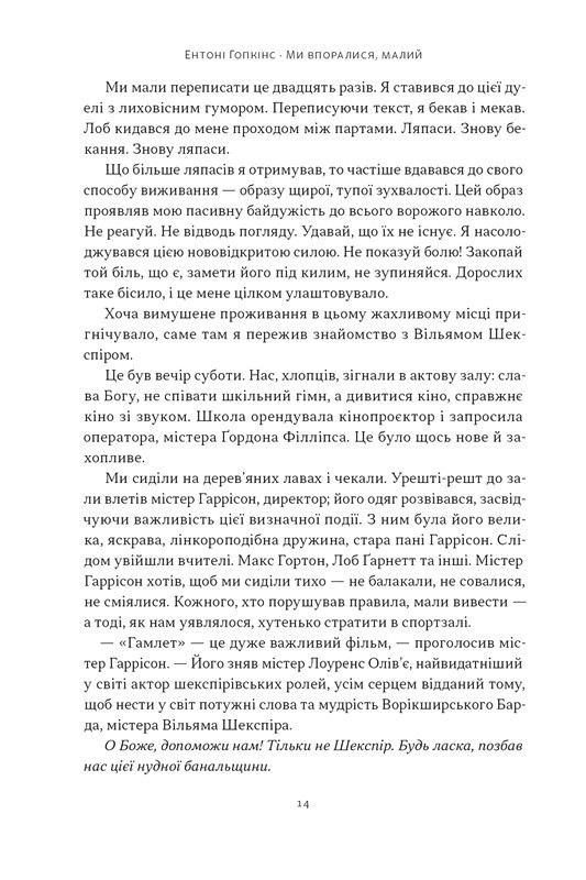 “Ми впоралися, малий” — це не просто книга спогадів, а щира розмова з самим собою, яку веде один із найвідоміших акторів сучасності. Ентоні Гопкінс ділиться дорогою, що привела його від сором’язливого хлопця до світового визнання, і робить це з такою чесністю та теплом, що вже з перших сторінок виникає відчуття особистої зустрічі. Його історії — це не портрет генія, а шлях людини, яка навчилася приймати власні страхи, сумніви, невдачі та перетворювати їх у силу.
