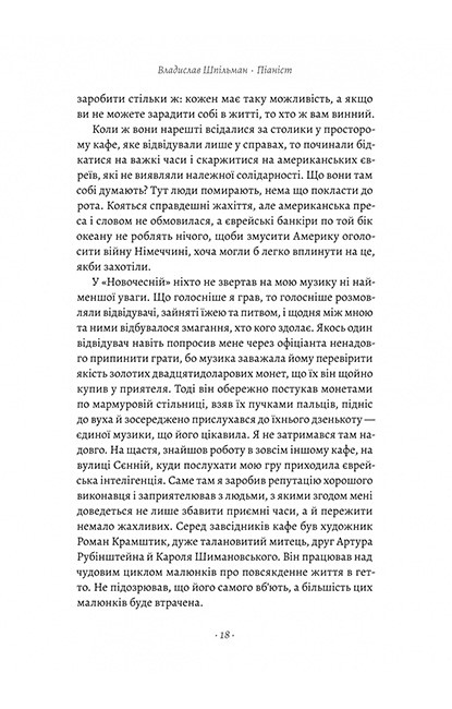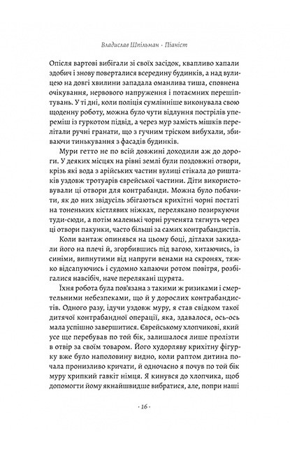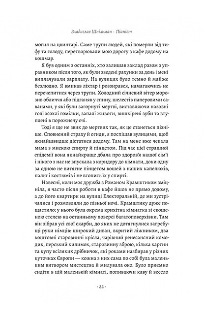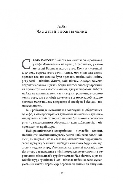 Це щемлива й вражаюча автобіографія талановитого польського піаніста Владислава Шпільмана, який пройшов крізь жахи Другої світової війни та Голокосту. Йому вдалося вижити у Варшавському гетто, рятуючись завдяки музиці, випадку та небайдужим людям. «Піаніст» — це свідчення про силу мистецтва і незламність людського духу.