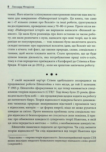 Ця книга — теплий і водночас надихаючий спогад про видатного вченого Стівена Гокінґа, написаний його близьким другом і колегою Леонардом Млодіновим. Автор розповідає про їхню багаторічну співпрацю, наукові пошуки та справжню дружбу, яка виходила за межі формул і теорій.