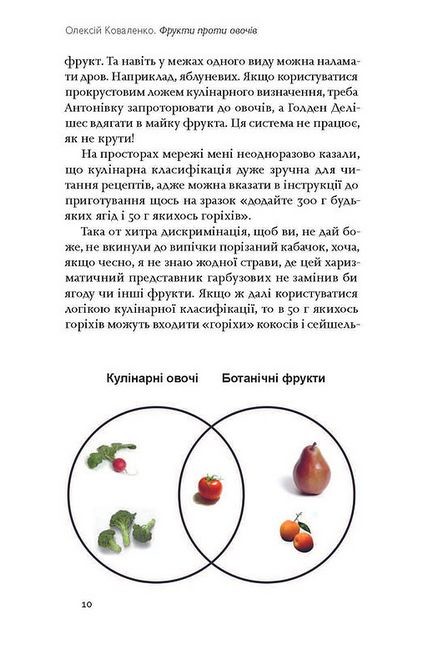 Усе своє життя, успішно проігнорувавши ботаніку, ми керуємося лише одним простим (і хибним) правилом: солодке — фрукт, а все решта — овочі. Насправді це так не працює. У книжці «Фрукти проти овочів» ботанік, музейник та автор блогу «Довколаботаніка» Олексій Коваленко розповість справжню історію продуктів, які ми щодня бачимо на кухні та в супермаркеті, а ще навчить відрізняти овоч від фрукта, горіх — від горішка, а кавун — від ягоди. У книжці Олексій пояснить, хто намагався лікувати огірками безпліддя та укуси скорпіонів, як салату приписали здібності впливати на чоловічу потенцію, звідки примандрував до нас буряк та як приготувати каштани в домашніх умовах і не рознести квартиру на шматки. Перед вами — не збірник рецептів і навіть не підручник з ботаніки, книжка Олексія Коваленка — це реальна та дотепна історія найзвичайнісіньких овочів і фруктів: від особливостей їхньої ДНК та селекції до найдивніших міфів і кулінарних лайфхаків.