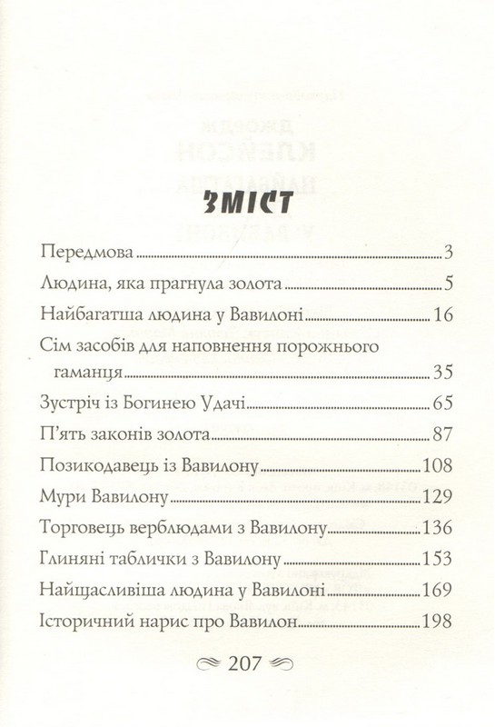Ця книжка веде читача у легендарний Вавилон, де стародавні купці та мудреці відкривали секрети добробуту, які актуальні й сьогодні. «Найбагатша людина у Вавилоні» – це збірка притч, що простими історіями пояснює складні фінансові принципи: як накопичувати, примножувати, планувати та приймати відповідальні рішення щодо грошей.