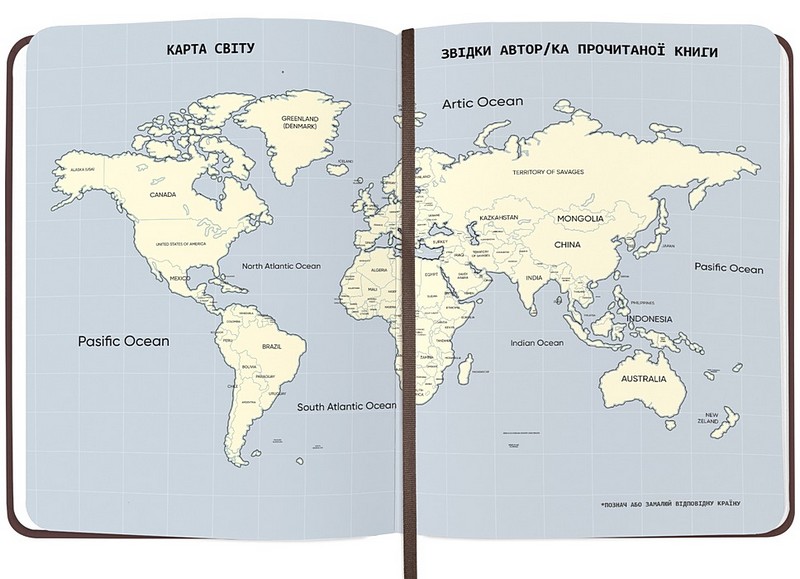 - яскраві розвороти з цитатами, книжковий вішліст та карта світу, де можна відмітити місця життя та роботи авторів