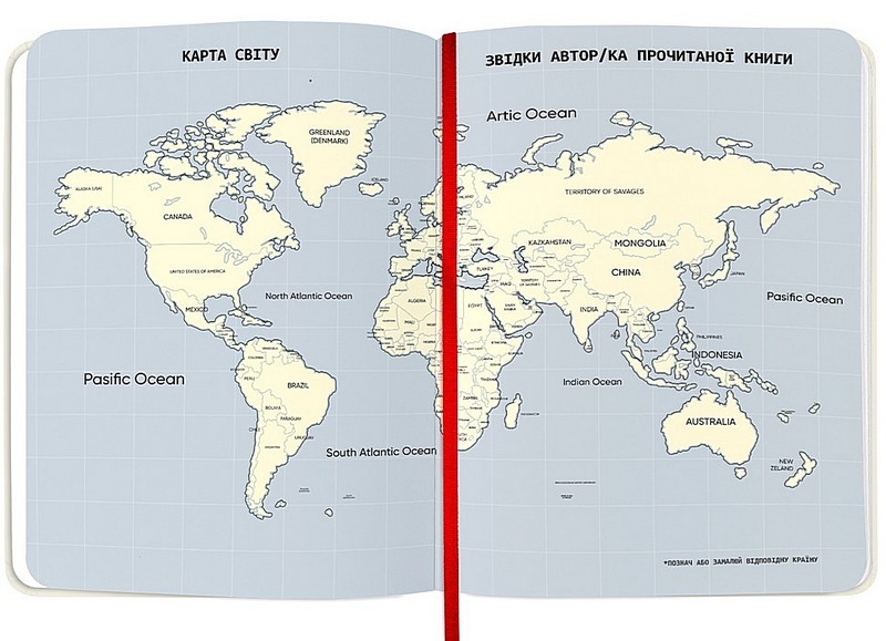 - яскраві розвороти з цитатами, книжковий вішліст та карта світу, де можна відмітити місця життя та роботи авторів