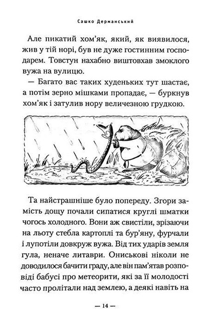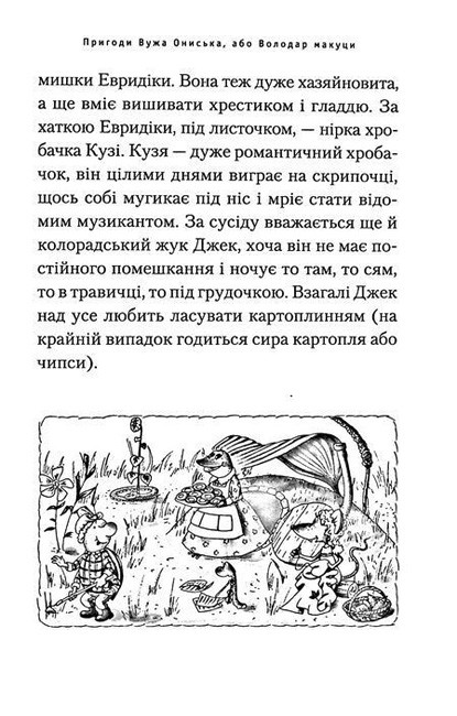 Зайчики, білочки, песики, котики, курчатка і каченятка… Подібних милих істот немає в цій книжці. Бо вона про тих, від кого дитячі письменники з доброго дива вернуть носа. Але, на щастя, не всі. Сашко Дерманський написав кумедну, зворушливу й цікаву історію про дружну, хоч і строкату компанію. Байдуже, що герої не надто пухнасті. Повір, вони теж страшенно милі. Вужик Онисько, жабка Одарочка, мишка Евридіка, хробачок Кузя і жук Джек — справжні друзі. А їхні пригоди — на суходолі, на воді й у повітрі — просто шалені!