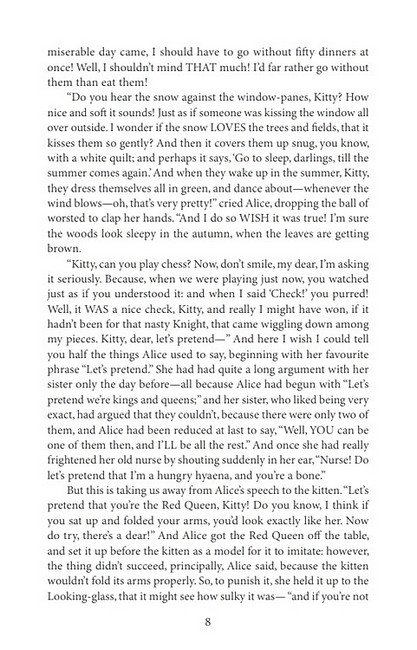 «Аліса в Задзеркаллі» — продовження знаменитої казки про пригоди Аліси, можливо, найзнаменитішої героїні англійської літератури. У дивовижній країні-шахівниці, де все навпаки, на дівчинку чекає безліч загадок і дивних персонажів. Та чи дійсно це тільки її сон?..