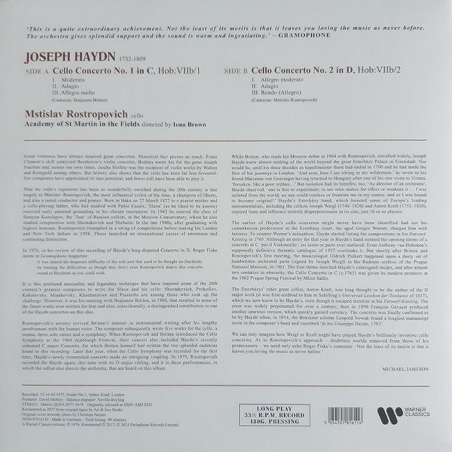 Цей запис поєднує два знакові концерти Йозефа Гайдна для віолончелі з оркестром: до мажор (C-dur) — довго вважався втраченим і був знайдений у XX столітті, та ре мажор (D-dur) — більш відомий, блискучий і технічно складний. Ростропович виконує їх із бездоганною ясністю, емоційністю та внутрішнім змістом.