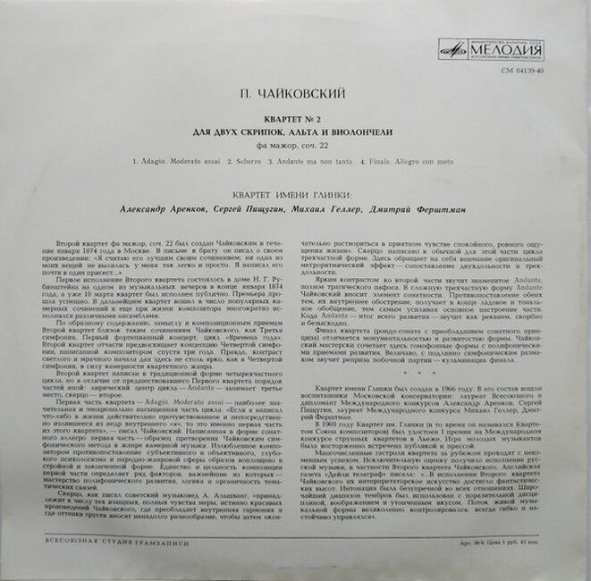 П. И. Чайковский, Квартет Имени Глинки – Квартет № 2 Фа Мажор (Vinyl)