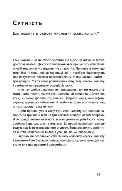 «Есенціалізм. Мистецтво визначати пріоритети» — це не просто книжка, а спосіб мислення. Автор Ґреґ Маккеон переконує: бути постійно зайнятим — не означає бути ефективним. У світі нескінченних справ і нотифікацій він пропонує радикальний підхід — відсікати несуттєве, щоб звільнити місце для найважливішого. Це книга про дисципліновану вибірковість — і саме в цьому її сила.
