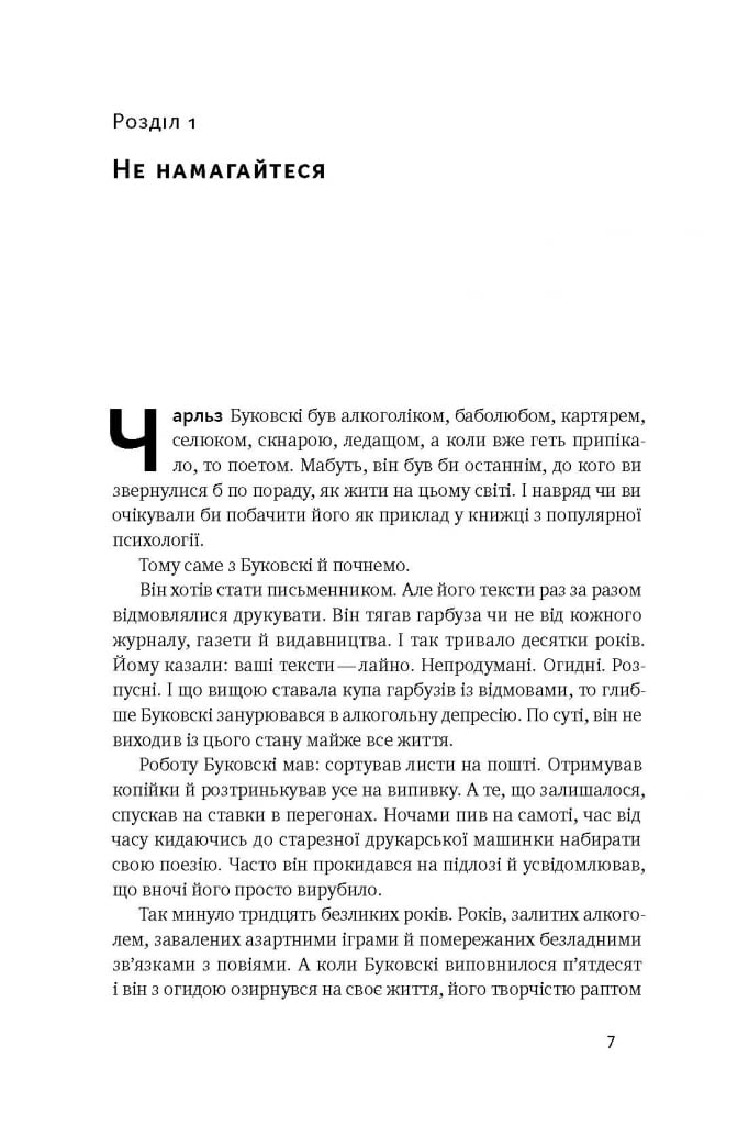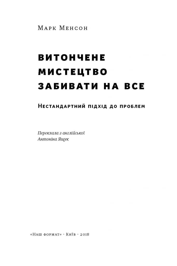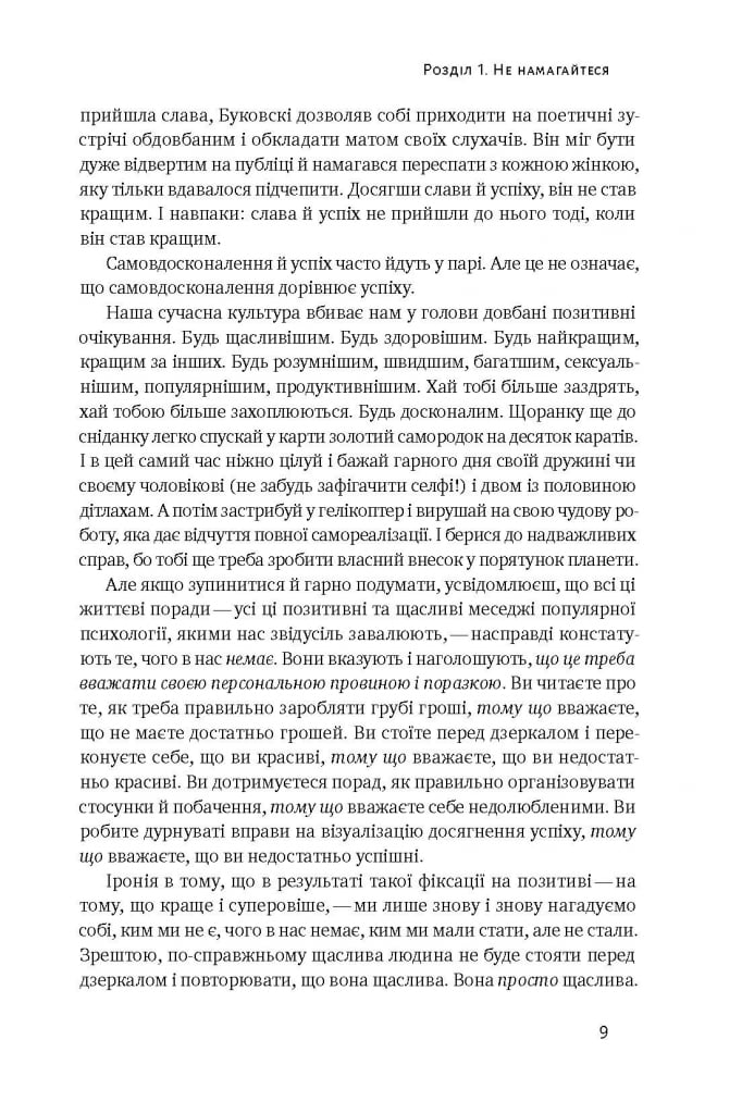 Ми живемо в культурі, зацикленій на занадто оптимістичних очікуваннях. Із самого дитинства нам нав'язувати язують нереалістичні ідеали, яких ми прагнемо досягти попри все: лише найвищі оцінки, досконала зовнішність, надсучасні ґаджети, найкрутіша робота, тільки екзотичні подорожі й не менш яскраві світлини в соцмережах. Постійно женучись за успіхом i щастям, ми намагаємося унікати будь-якого негативу. Однак негативний досвід, як переконує Марк Менсон, надзвичайно цінний: він звільняє нас від міражу щастя.