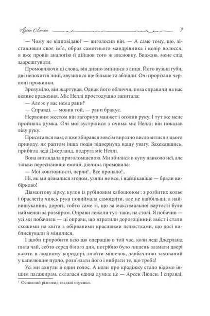 Герой дев’яти новел — неперевершений грабіжник, своєрідний «перекоти-поле», який керується лише власним кодексом честі і, що головне, не звик ніколи відступати. Неабиякої інтриги його пригоди набувають, коли доходить до такої собі гри в «поліцейські та злодії» і на шляху вигадливого авантюриста виростає непереможний англійський детектив Шерлок Голмс. Чи вдасться джентльмену-грабіжнику перемудрувати славетного джентльмена з Бейкер-стріт (хай ім’я його і змінене — до речі, через протест Конан-Дойля — та неважко збагнути, що мова саме про нього!)? Хай там як, але мільйони шанувальників Моріса Леблана та його чарівного героя Арсена Люпена майже століття гадають, чим же скінчиться цей поєдинок, і, втім, він не закінчується й досі. Чудова забава для любителів гостроцікавого сюжету й красного слова водночас.
