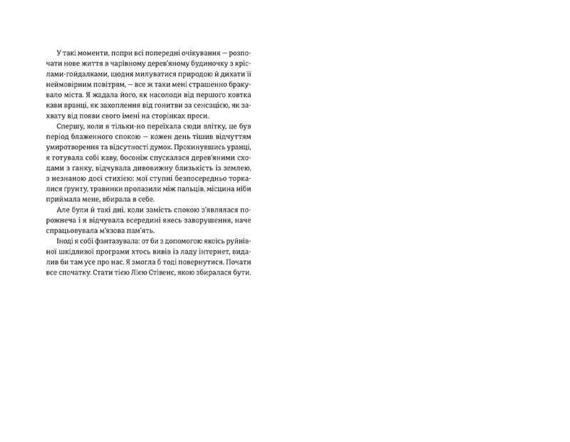 За спиною колишньої журналістки Лії Стівенс багато невдач і болючих помилок — їх не вийде ні загладити, ні забути, ні притлумити плином часу. Аби якось налагодити життя, Лія втікає в Пенсільванію разом із вірною подругою Еммі. Вона хоче зачаїтися, принишкнути. Але привид минулого невтомно переслідує її. Біля річки знаходять жінку, дуже схожу на неї. Усі довкола тепер дивляться на Лію з підозрою. Здавалося б, Еммі могла б допомогти розплутати ситуацію, але біда — поліціянти в один голос стверджують, що Еммі насправді ніколи не існувало.
