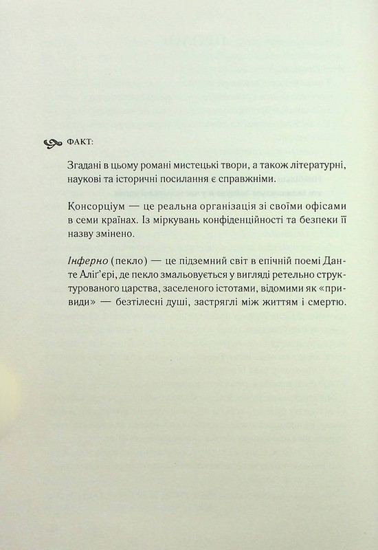 «Інферно» — це інтелектуальний трилер із елементами детективу, історичного роману й філософської притчі. Події розгортаються у Флоренції, Венеції та Стамбулі — містах, де історія дихає в кожному камені. Тут стародавні картини, архітектурні шедеври та цитати з Данте стають ключами до глобальної загадки. Атмосфера напруження наростає з кожною сторінкою, а фінал вражає масштабом і глибиною ідей.