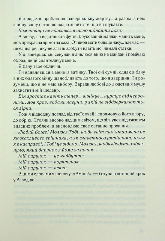 Це роман, що поєднує динаміку детективу, інтелектуальність наукової фантастики та естетику мистецтва. Ден Браун створив не просто захопливу історію — це роздуми про людство, моральні межі науки і страх перед власними винаходами. Книга спонукає замислитись: що робить нас людьми і чи маємо ми право втручатися в еволюцію?