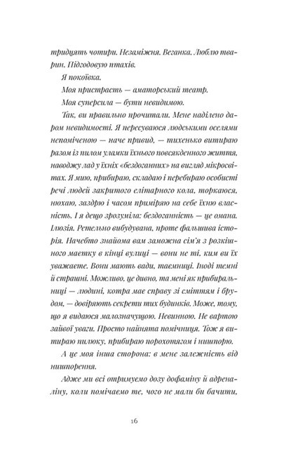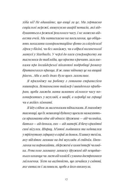 Психологічний трилер, який тримає в напрузі до останньої сторінки. Покоївка знає про своїх клієнтів усе — їхні звички, слабкості та потаємні таємниці. Але що буде, коли її записи перетворяться на доказ? І які демони ховаються у самій жінці, яка щодня прибирає чужі сліди?