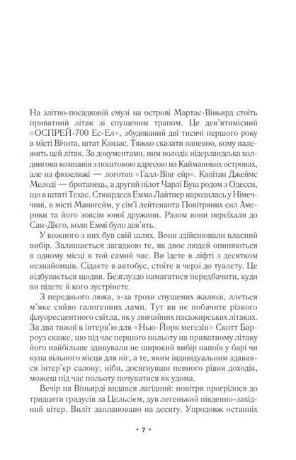 Неподалік від Нью-Йорка в океан упав приватний літак. Двоє пасажирів дивом дісталися берега. Подія сколихнула всіх: поки ЗМІ та суспільний загал шукають винних, агенти кількох компетентних органів розслідують справжні обставини катастрофи. Як з’ясовується, чи не кожен із одина дцяти осіб,що були на борту, мав свою таємницю, тож причиною падіння міг бути нещасний випадок, теракт, ба навіть особиста помста. Автор вибудовує захопливий детективний сюжет, подає оригінальний зразок сучасного трилера,майстерно жонглюючи деталями та створюючи незабутні людські характери.