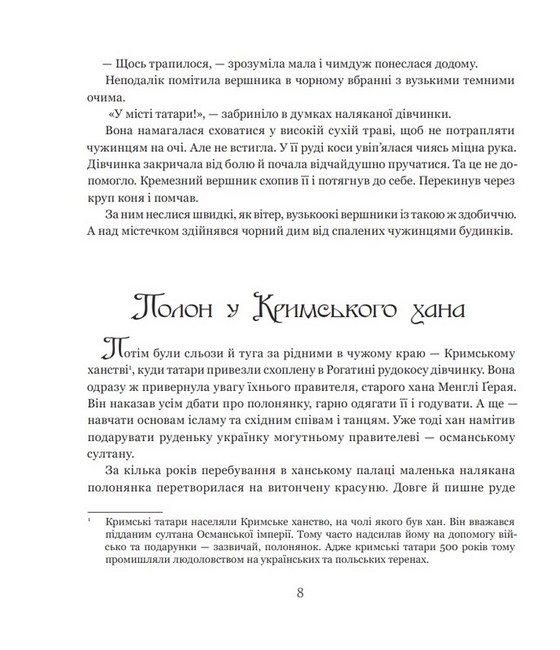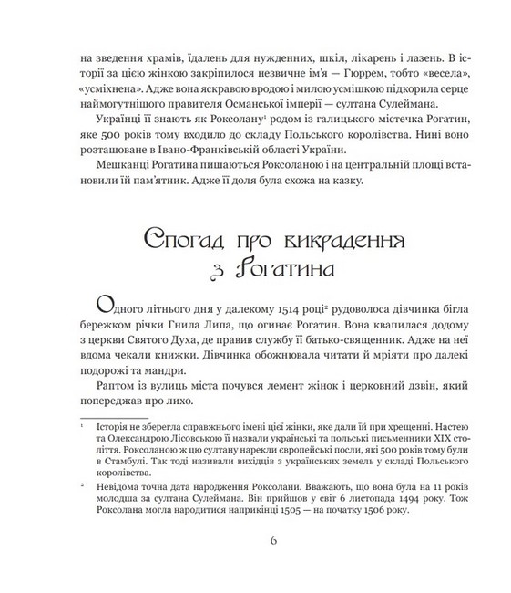 Історія українки Роксолани вражає. Адже вона пройшла складний життєвий шлях — від полонянки кримського хана до дружини султана Сулеймана та матері його наступника — Селіма Другого. Відтак у Стамбулі отримала ім’я Гюррем. За життя ця жінка листувалася із правителями Європи та Азії, мала великий вплив на політику та активно займалася благодійністю. У книжці йдеться про її життєвий шлях, місце в історії та велику родину.