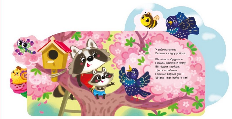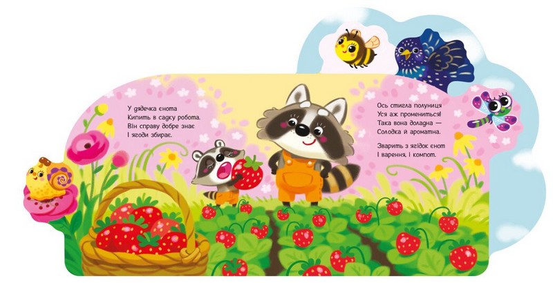 Герой книжечки — працьовитий садiвник дядечко єнот. У своєму квiтучому садочку вiн доглядає рослини, майструє шпакiвню, збирає ягiдки, розводить бджiл i косить траву. Зворушливi вiршики, емоцiйнi малюнки та оригiнальна форма книжки, безперечно, сподобаються вашому малюку.