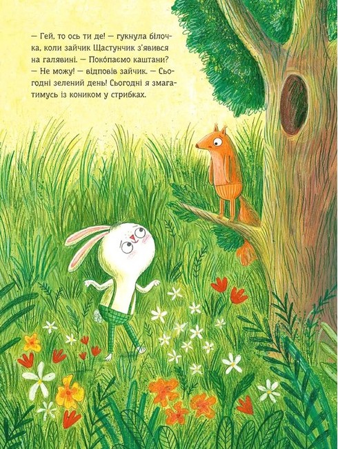 Зайчик Щастунчик зовсім не радий. Щодня йому доводиться вирішувати, що вдягти, з ким гратися й чим поласувати. Тому Щастунчик вигадує, що відтепер ухвалювати всі рішення за нього має колесо фортуни: синій колір на користь синього шалика, лохини на обід і веселощів із павичем. Зелений — на користь зелених штанців, соковитої трави на перекус і стрибків наввипередки з коником. Але чи щасливий тепер Щастунчик? Він чекає, щоб випав помаранчевий! Адже тоді нарешті буде морква й можливість пограти у футбол із білочкою. Раптом Щастунчик усвідомлює, що насправді щасливим його робить… СТРОКАТІСТЬ!