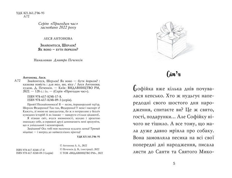 Зацікавив? Ось тобі моя маленька кудлата лапка! Тримай міцніше – і вперед до найвеселіших пригод!Привіт! Познайомимося? Я – песик, йоркширський тер’єр, Шерлок Федоренко! Так-так, Федоренко! У мене і паспорт є! Кажуть, зі мною не занудьгуєш, бо ж я потрапляю у безліч кумедних історій! А як інакше – навкруги стільки цікавого!.. Я пізнаю світ, вчуся впевненості, шукаю і зрештою знаходжу себе, а справжні друзі допомагають мені зрозуміти, що я унікальний і неповторний.