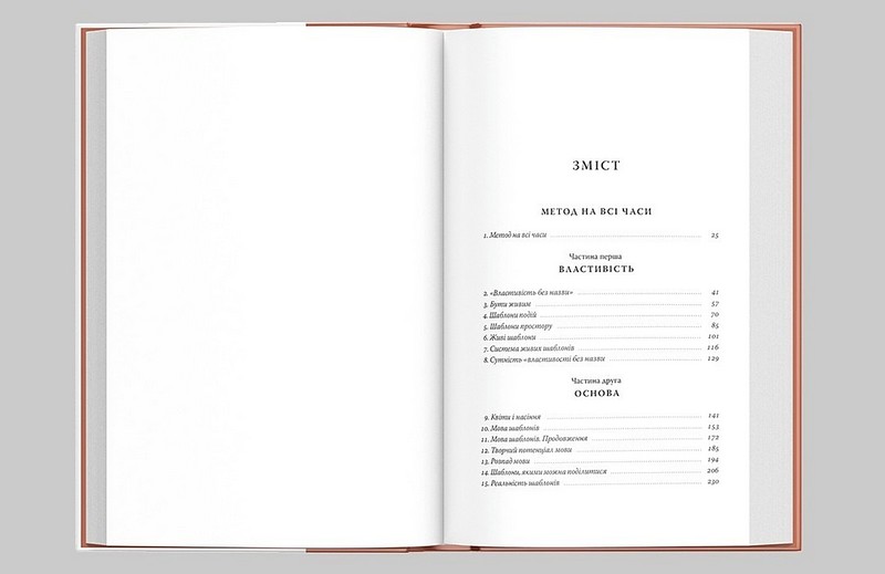 Це теоретичний том, присвячений «дао» архітектури — глибокому зв’язку між рукотворним середовищем і людським єством. Александер звільнив архітектуру від монополії архітекторів, доповнив інструментарій архітектора почуттями і переконливо продемонстрував: те, що ви побудуєте, залежить від того, хто ви такі.