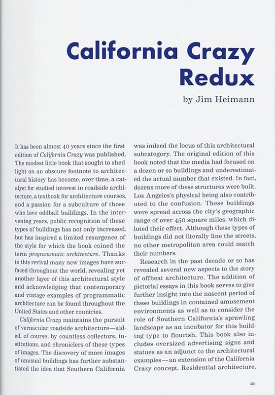 Крім того, California Crazy містить визначальне есе Девіда Гебгарда, який майже сорок років тому окреслив цей вернакулярний рух. Концепцію California Crazy розширено — тепер вона охоплює житлову архітектуру, ексцентричну візуальну символіку та автомобіль як фантазійний об’єкт.