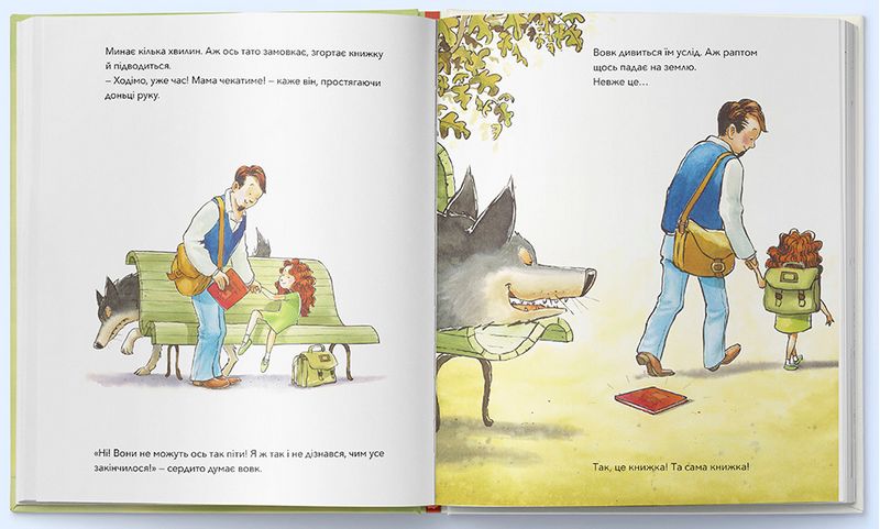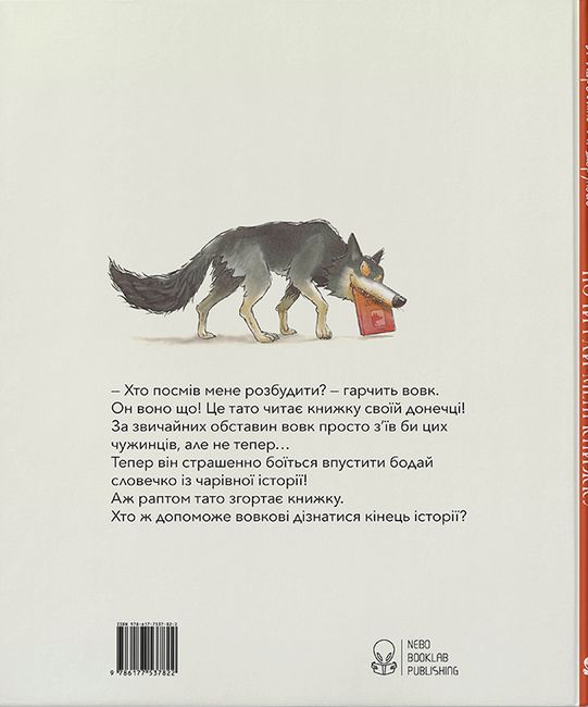 — Хто посмів мене розбудити? — гарчить вовк. Он воно що! Це тато читає книжку своїй донечці! За звичайних обставин вовк просто з’їв би цих чужинців, але не тепер… Тепер він страшенно боїться впустити бодай слівце з чарівної історії! Аж раптом тато згортає книжку. Хто ж допоможе вовкові дізнатися кінець історії?