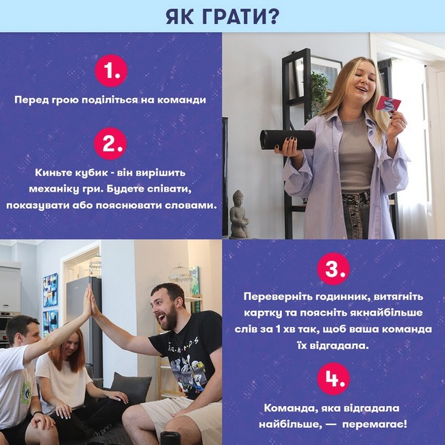 Якщо ви шукаєте ідеальний спосіб розважити друзів і додати трохи перцю у вечірку, то ця гра створена саме для вас! "Скажи або покажи 18+" — це вибух емоцій, сміху та несподіванок, який перетворює будь-яку компанію на справжній центр уваги. Тут вам доведеться або без слів пояснювати гарячі слова, або показувати їх жестами, або співати — все це з легкою зухвалістю та великою дозою гумору.