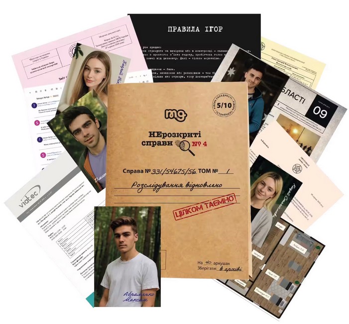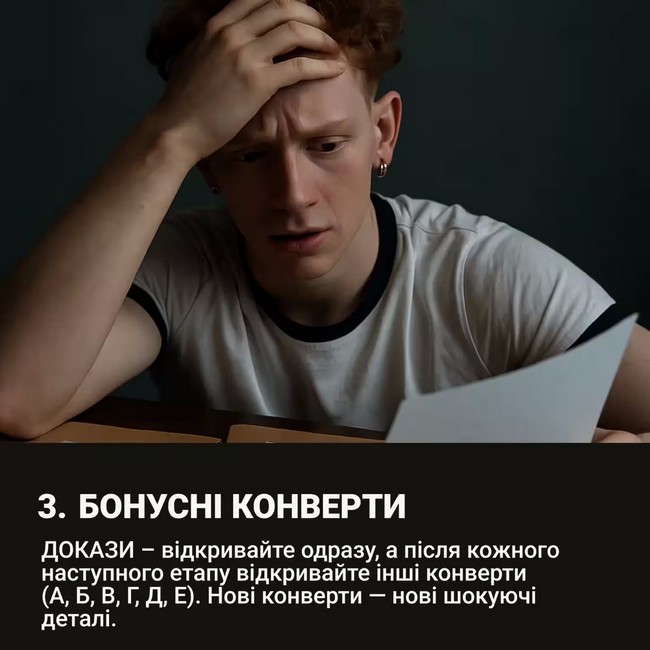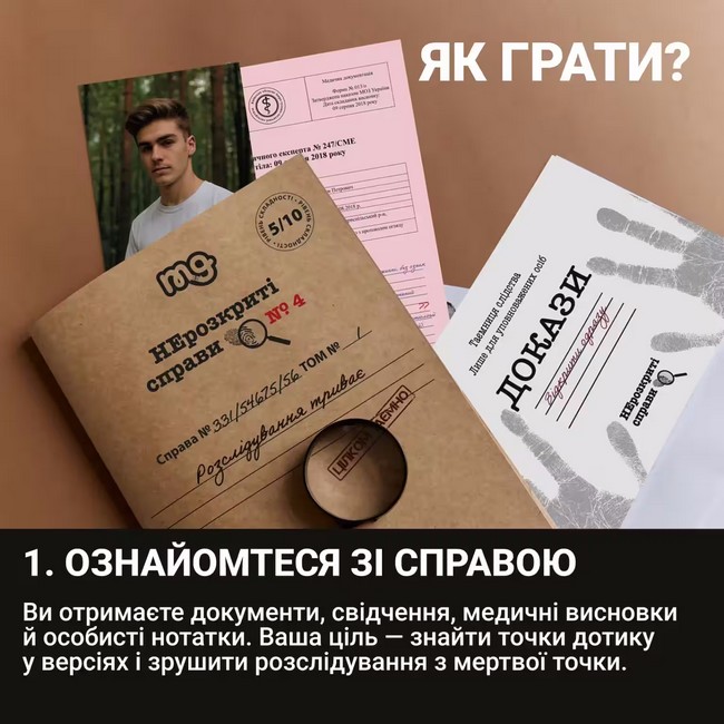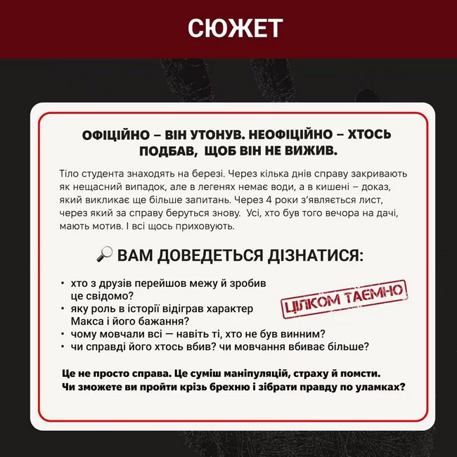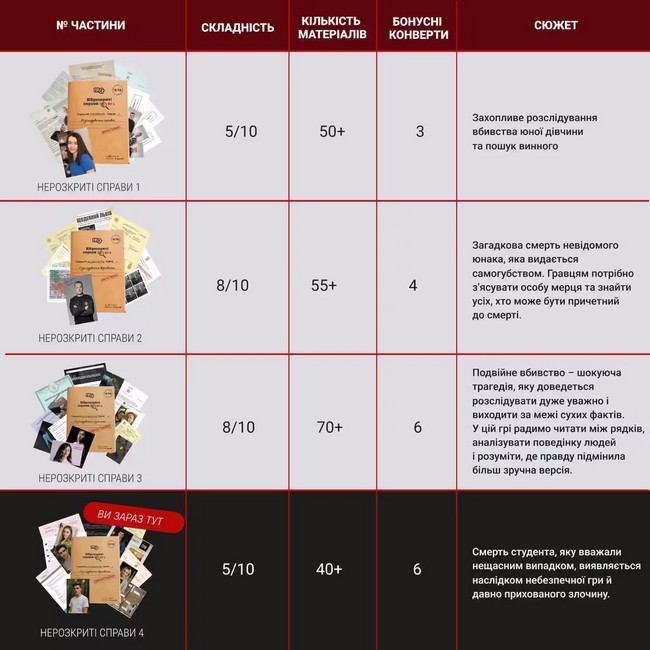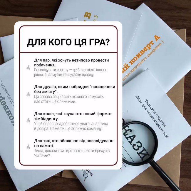 • У грі: 6 підозрюваних, 40+ доказів, 6 конвертів із новими фактами.