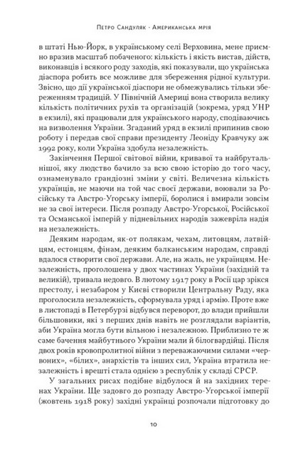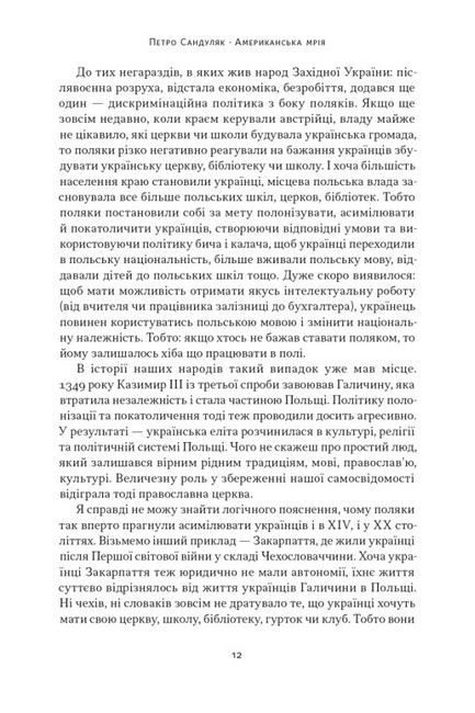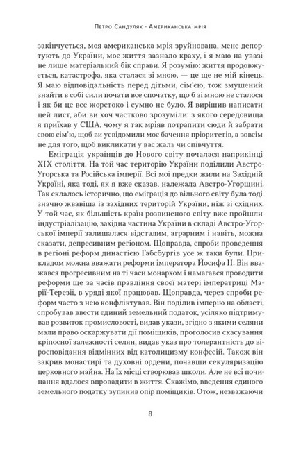 Із цієї книжки читач отримає багато інсайтів про життя і роботу в США. На досвіді своєї сім’ї автор показує красу Нового світу, радість від перемог і звершень на шляху до здійснення «американської мрії». І водночас — переосмислює її крихкість, жорстокість та підводні камені. Книжка Петра Сандуляка — це корисний путівник з іммігрантського життя та реалій бізнесу в іншій країні, чесна розповідь про «обітовану» для тисяч українців землю.