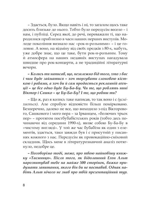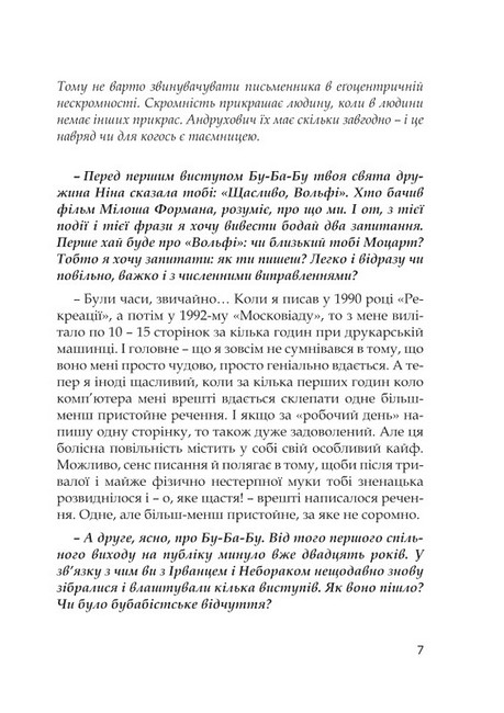 На її сторінках безкомпромісні, особисті та дуже живі слова про Джойса й Антонича, творчість та буденність, везіння та сенс за межами тексту, самоцензуру та бітників, але найбільше — про Україну, політику та патріотизм, в кінцевому підсумку — про все те, чим живе Андрухович і з чим готовий ділитися зі своїми читачами.