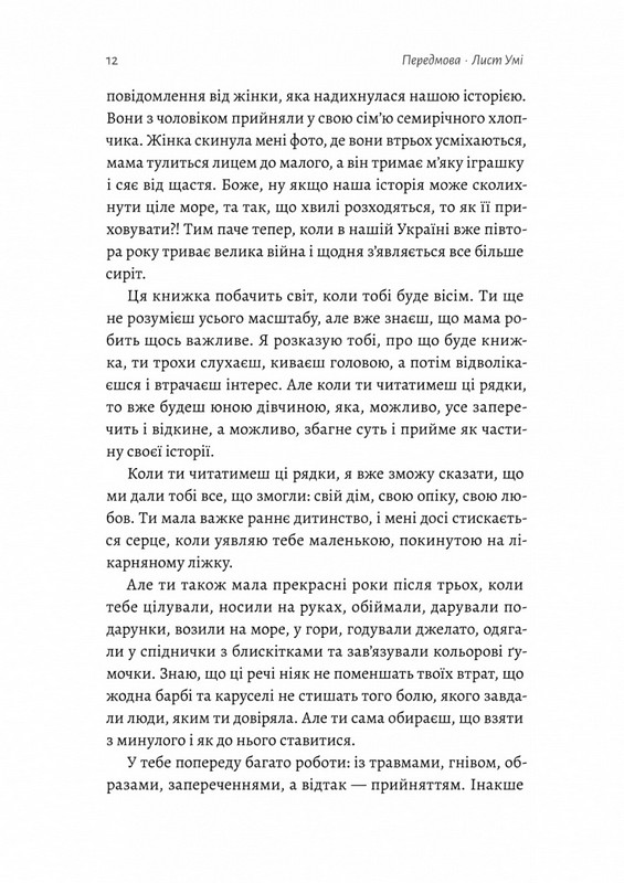 Відповіді на ці питання авторка книжки Ольга Бартиш шукала, коли вирішила написати власну історію та поділитись своїм досвідом усиновлення. Пошуки привели її до абсолютно інакших викликів — як полюбити свою внутрішню дитину? Як прийняти в собі ту маленьку дівчинку, що прагне свободи та проявлення і просто дозволити їй бути?