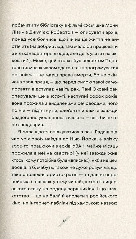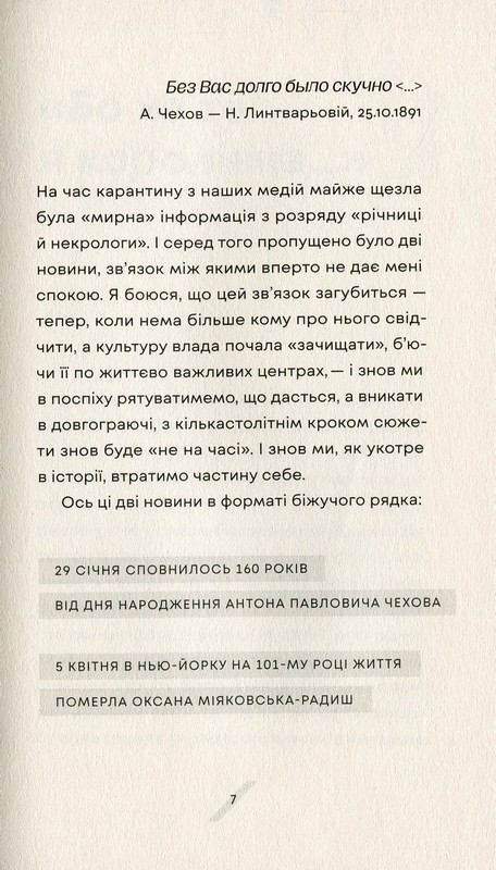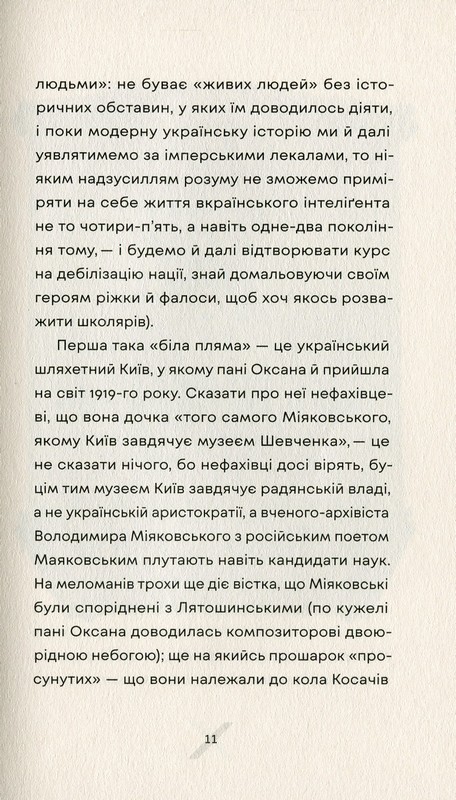 У новій книжці, присвяченій пам’яті архіваріуса Української Вільної Академії Наук у Нью-Йорку Оксани Міяковської-Радиш (1919–2020), Оксана Забужко звертається до свого улюбленого жанру — міксу мемуару, літературознавчої розвідки та інтелектуального детективу. Читачеві пропонується пройти захопливим маршрутом завдовжки в півтора століття, від сімейної світлини в нью-йоркській вітальні — до українського Таганрога і дитячих вистав «Москаля-чарівника» в домі Чехових, щоб знайти відповідь на одне з головних питань сьогодення: за які уроки історії, пропущені в XIX ст., Україна змушена розплачуватися ще і в XXI?