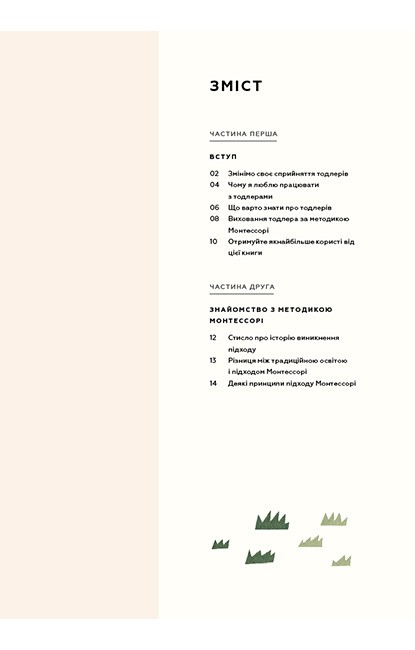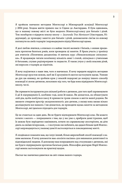 У цій книзі ви знайдете все, що необхідно знати батькам про виховання за системою Марії Монтессорі. Авторка — педагог й засновниця школи Монтессорі — розповідає, як мамам і таткам зберігати спокій у будь-якій ситуації, як розвивати в малюку віком від 1 до 3 років допитливість і які заняття будуть цікаві й корисні для нього. Теорію доповнюють чудові ілюстрації та історії Монтессорі-родин із різних куточків світу.