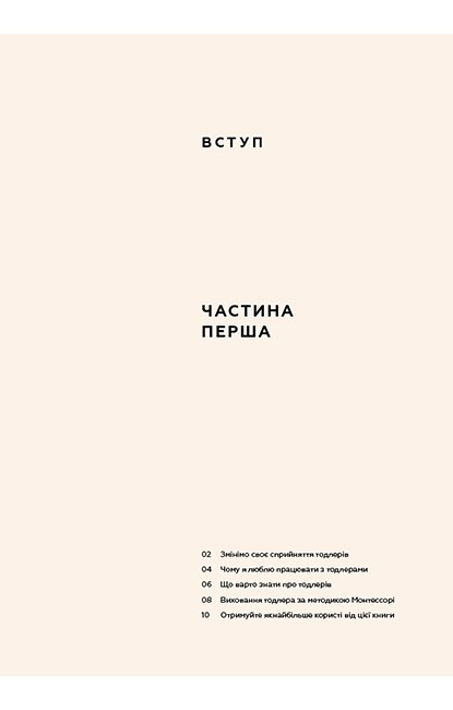 Цей посібник — справжній подарунок для батьків, які прагнуть виховати дитину не «зручною», а свідомою, самостійною й допитливою. «Монтессорі для малюків. Як виховати допитливу й відповідальну дитину. Посібник для батьків» ґрунтується на філософії Марії Монтессорі, адаптованій для дітей віком від одного до трьох років. Авторка ділиться практичними порадами, спостереженнями та методами, які допоможуть побудувати вдумливе, поважне й м’яке середовище для розвитку дитини.