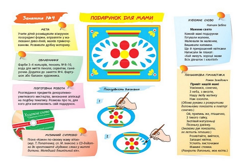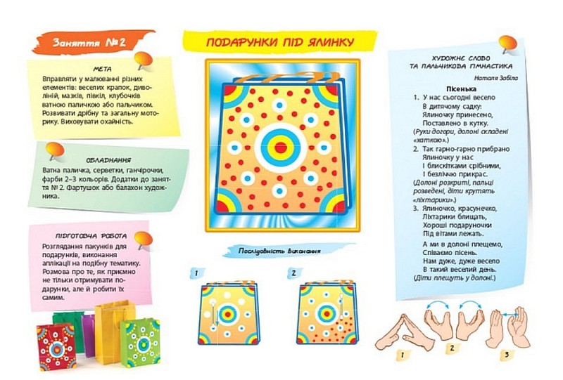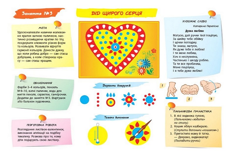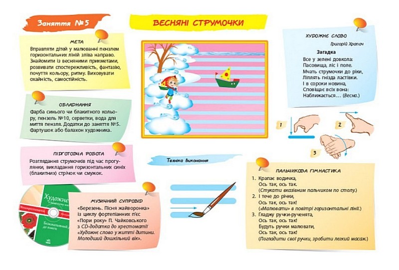 Тематика занять пов’язана із сезонними явищами природи, працею людей, традиціями української національної культури. Рекомендовані автором поетичні твори, музичний супровід, пальчикова гімнастика, фігурки для пальчикового театру забезпечують різні форми дитячої активності (пізнавальну, соціально-моральну, емоційно-ціннісну, мовленнєву, фізичну, креативну, художньо-естетичну тощо). Подані у двох варіантах (на вибір дитини) додатки — робочі аркуші для малювання — сприятимуть самореалізації дитини, вихованню самостійності, самоповаги.