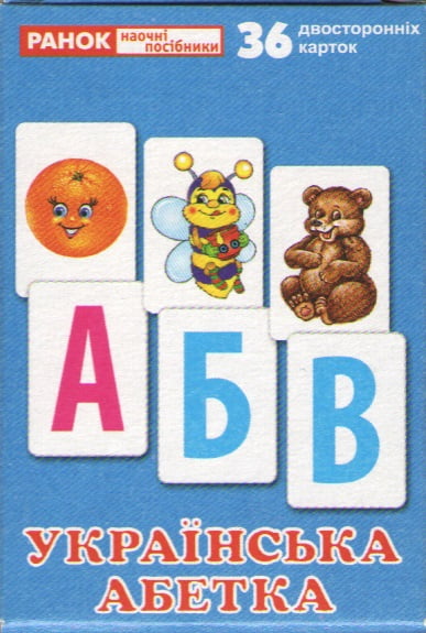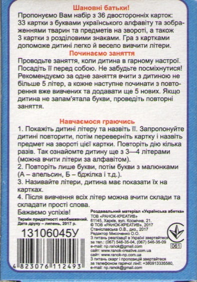 Пропонуємо вам набір з 36 двосторонніх карток: 33 картки з буквами українського алфавіту та зображеннями тварин на звороті, а також три картки з розділовими знаками. Гра з картками допоможе дитині легко й весело вивчити літери.