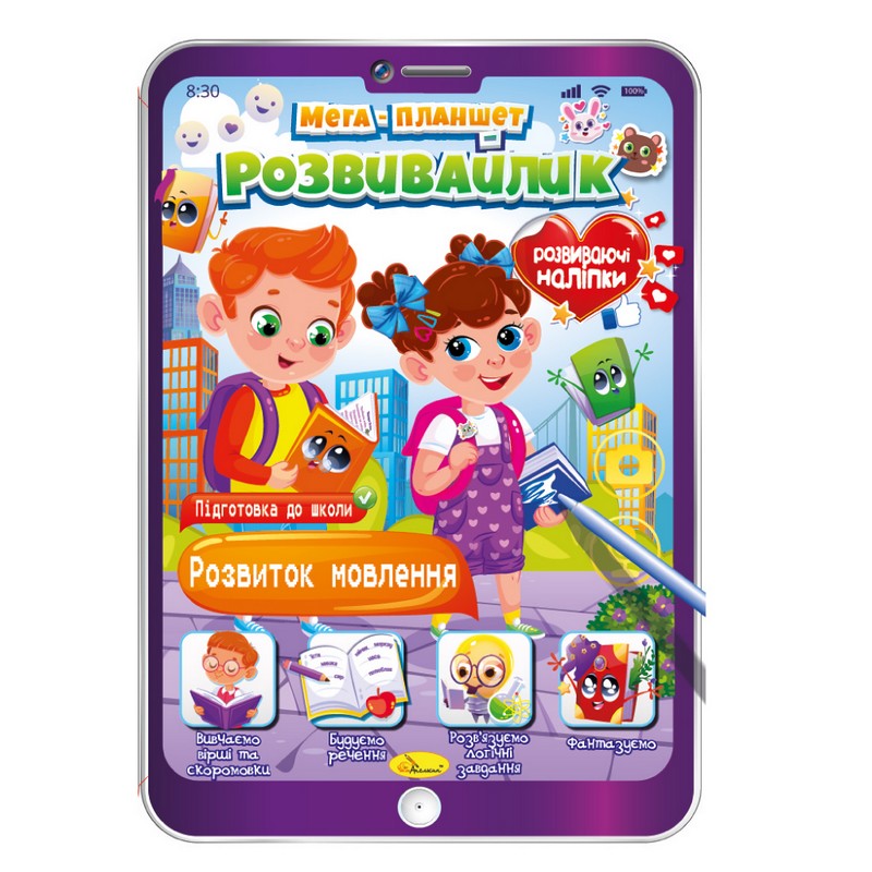 Мега-планшет «Розвивайлик. Розвиток мовлення» – це розвивальна розмальовка для дітей, створена спеціально для того, щоб допомагати формувати мовлення у цікавій ігровій формі. На сторінках планшета дитина знайде завдання на повторення слів, складання простих речень, розширення словникового запасу, опис малюнків, розуміння сюжету та послідовності подій.