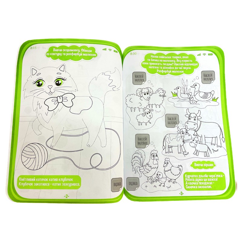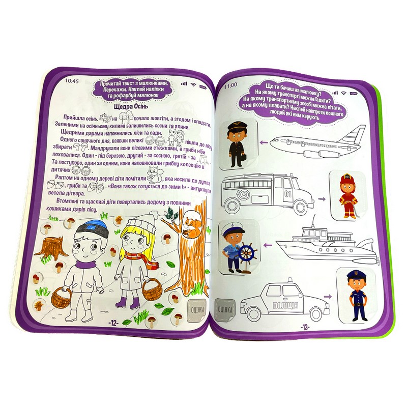 Планшет має формат В4, 16 сторінок, зручну крейдовану обкладинку з глянцевою ламінацією та якісний кольоровий друк. Внутрішній блок надрукований на щільному офсетному папері – на ньому приємно малювати олівцями, фломастерами або восковими крейдами. У комплекті є кольорові наліпки: дитина виконує завдання, доповнює ними зображення та отримує додаткову мотивацію у вигляді наліпок-оцінок. Робота з наліпками та розмальовками розвиває дрібну моторику, координацію рухів і готує руку до письма. Серія «Розвивайлик» має великий навчальний потенціал, а саме видання «Розвиток мовлення» стане корисним помічником для дошкільнят і молодших школярів, допоможе впевнено заговорити, краще висловлювати думки та полюбити навчання.