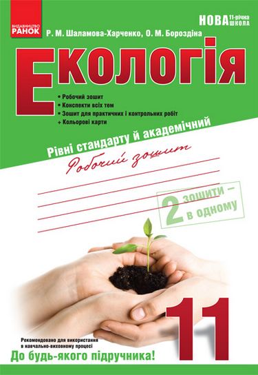 Зошит (автор Шаламова-Харченко Р.М.,Бороздіна О.М.) містить теоретичний матеріал і завдання для закріплення знань за всіма темами чинної програми з екології для 11 класів (рівень стандарту і академічний рівень). У вкладиші, що відділяється від основного зошита, розміщено всі практичні роботи, виконання яких передбачене програмою, та дві контрольні роботи, подані у двох варіантах. ризначений для учнів 11 класів загальноосвітніх навчальних закладів.