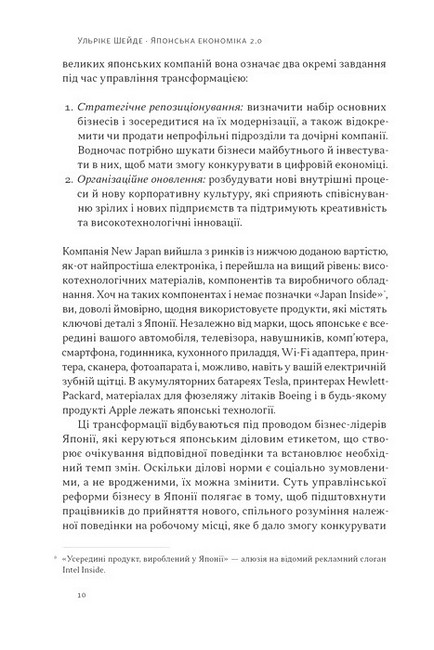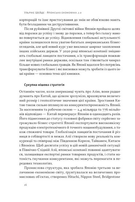 У своїй книжці Ульріке Шейде досліджує поточні бізнес-стратегії Японії. Як JSR, Toyota, Hitachi, SoftBank, AGC та багато інших компаній домінують у різних нішах на глобальних ринках? Чому японський «турботливий капіталізм», який ставить на соціальну стабільність, виявився конкурентнішим за американську модель нестриманого зростання? Авторка детально аналізує інноваційні процеси, системи управління та кадрові рішення, які дозволили Японії не лише зберегти статус лідера Азії, але й запропонувати світу більш збалансовану та стійку модель успіху.