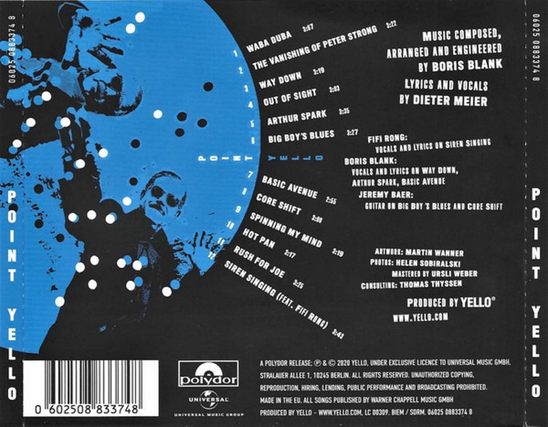 Point - студійний альбом Yello, який продовжує їхній фірмовий електронний підхід із поєднанням чітких ритмів, синтетичних текстур та ігрової експресії. Музика вирізняється характерним поєднанням електроелементів, поп-структур та візуально-саундтрекової атмосфери, що є впізнаваною рисою дуету.